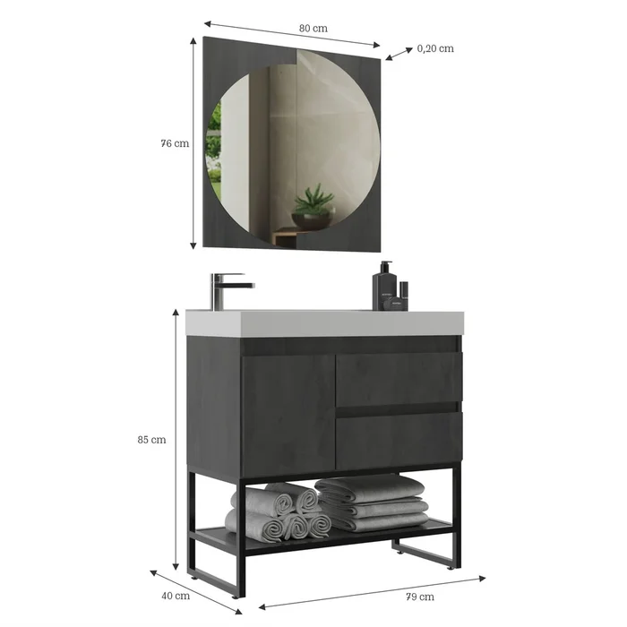 O CONJ BALCAO 80 CM BELIZZE é fabricado em MDF, possui pés de ferro, 1 porta e 2 gavetas com corrediças telescópicas, e acompanha espelho.
